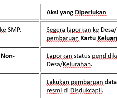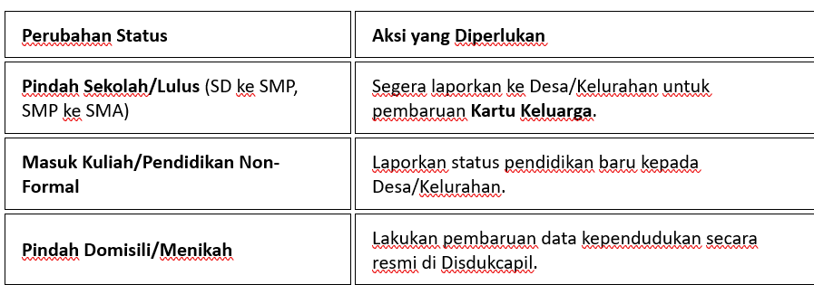 Setiap kali terjadi perubahan status signifikan pada anggota keluarga, khususnya anak usia sekolah, harus segera di-update datanya, yaitu: