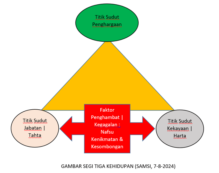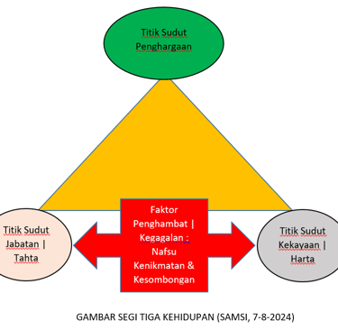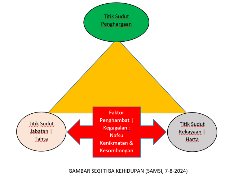 Mari kita pahami bersama gambar segi tiga kehidupan di atas menurut sudut pandang (Samsi, 7-8-2024). Segi tiga terbagi pada tiga titik sudut di mana sudut –sudut tersebut terbagi pada bagian alas terdapat 2 titik sudut adapaun kedua titik tersebut titik sudut jabatan dan titik sudut Kekayaan ( Harta). Sedangkan titik di atas merupakan titik puncak kehidupan manusia yang didambakannya yaitu penghargaan.